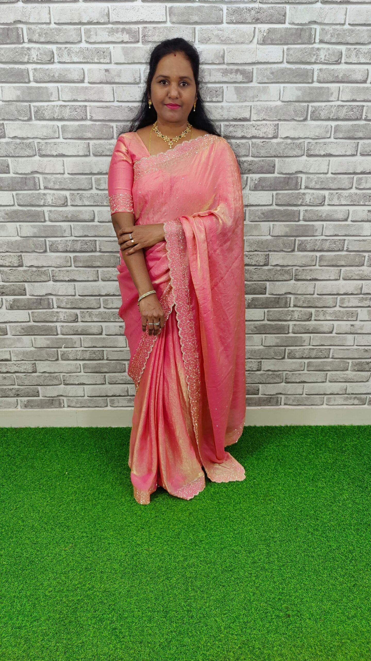 Premium fabrics like pure silk, georgette, organza, or crepe are used to give the saree an elegant flow and soft finish. The drape is lightweight yet structured — ensuring a graceful fall
