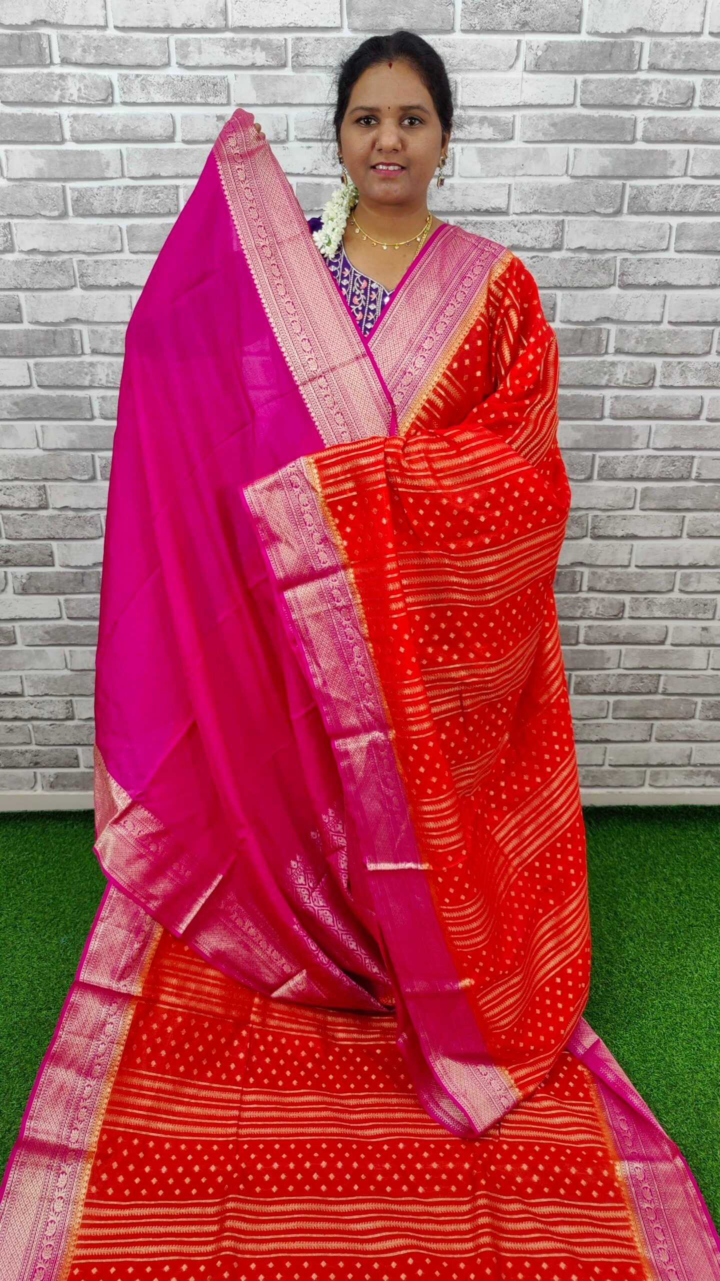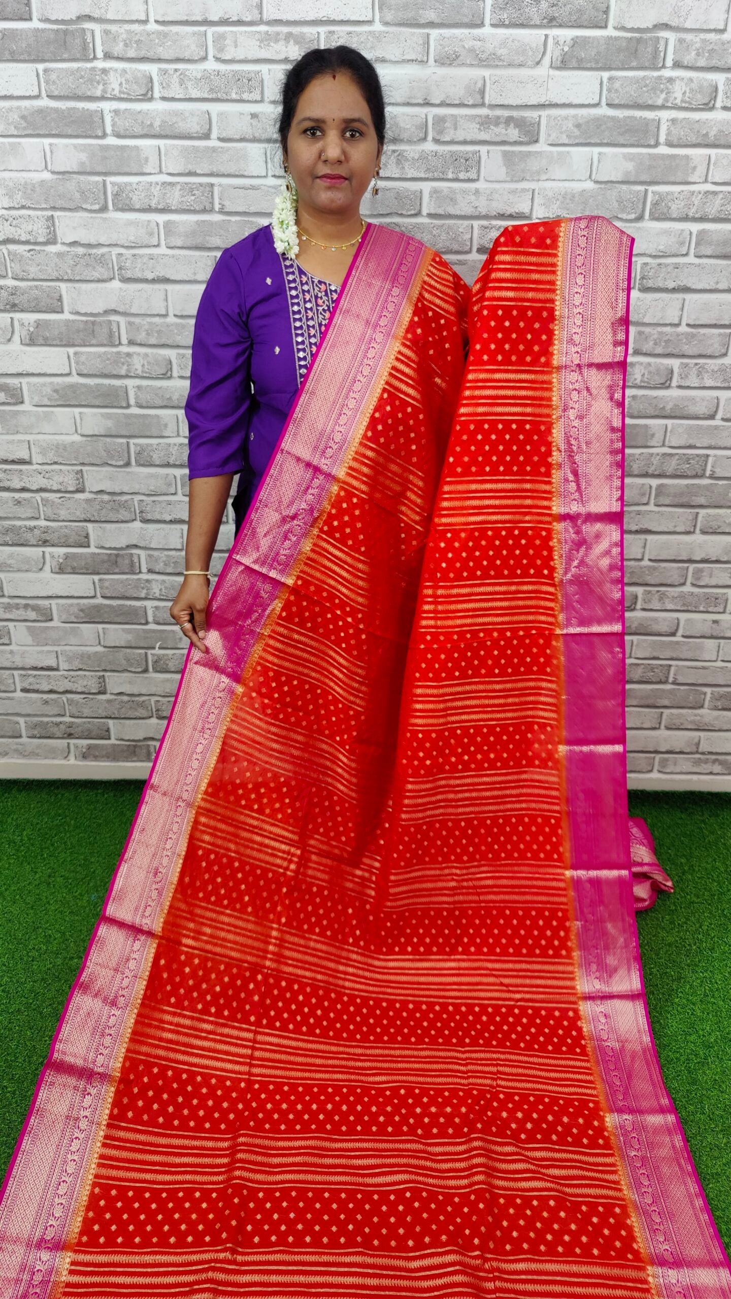 Crafted from high-quality silk, this saree promises a smooth and seamless drape that complements all body types. The rich, warm tones of the fabric create a radiant glow, making you the center of attention wherever you go. Silk is known for its breathable properties, ensuring you stay comfortable in every season, and the meticulous finishing adds durability to the garment, allowing you to enjoy its elegance for years to come.